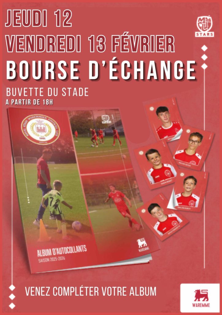 12Fév Bourse d’échange 3 février 2026Annonces , Evènements EDH Bourse d'échange pour compléter votre album d'autocollants. Les 12 et 13 février à la buvette du stade Du jeudi 12/02 à 18:00 au vendredi 13/02 à 20:00 Royal Stade Waremmien, Rue des Prés, Waremme, Belgique