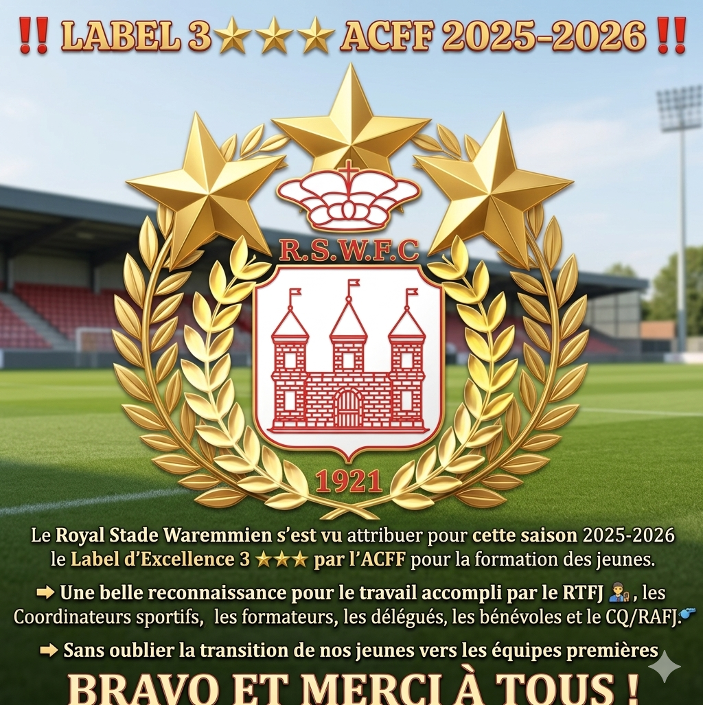 Label d’Excellence 3 étoiles ACFF 8 avril 2026Annonces , News EDH Le Royal Stade Waremmien s'est vu attribuer pour cette saison 2025-2026 le Label d' Excellence 3 ⭐️⭐️⭐️ par l' ACFF pour la formation des jeunes.